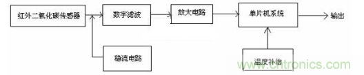 檢測電路由紅外二氧化碳傳感器、數(shù)字濾波電路、放大電路、穩(wěn)流電路、單片機系統(tǒng)、溫度補償?shù)冉M成。基本原理是紅外二氧化碳傳感器將檢測到的二氧化碳氣體濃度轉換成相應的電信號,輸出的電信號分別經(jīng)過濾波、放大處理,輸入到單片機系統(tǒng),并經(jīng)溫度和氣壓補償?shù)忍幚砗螅蓡纹瑱C系統(tǒng)輸出送顯示裝置顯示其測量值。