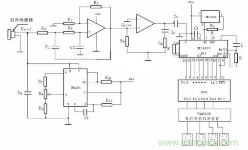 按照上述設計原理,設計的二氧化碳檢測電路如圖3所示。工作原理是首先由紅外傳感器將探測到二氧化碳氣體的濃度并轉換成電信號,濾波電路提取電信號并輸出到放大電路,經(jīng)過單片機系統(tǒng)處理后輸出,再由74AC138送入顯示電路,以實現(xiàn)對二氧化碳氣體濃度的檢測。