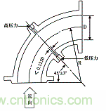 彎管傳感器利用管道系統(tǒng)彎頭作檢測元件,無附加壓損及專門安裝節(jié)流元件是其優(yōu)點,彎管取壓口開在45o處,取壓口結(jié)構(gòu)與標(biāo)準(zhǔn)孔板相同,兩個平面內(nèi)的兩個取壓口對準(zhǔn),使其能處于同一條直線上,如圖4。