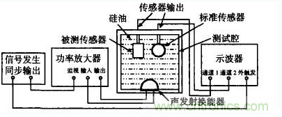 采用間接比較法測量傳感器的靈敏度,在聲場均勻的油腔內,距發射源相同距離處放置標準傳感器和被測傳感器,兩傳感器同時接收換能器發射的聲波信號,用示波器分別測量2只傳感器的輸出峰值電壓V標和V測,得到V標/V測=M標/M測,即