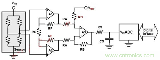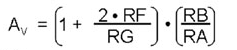 其中VREF代表ADC的參考電壓,“Sensor FS”是傳感器的滿刻度輸出值。假設電阻完美匹配,那么儀表放大器的增益等于: