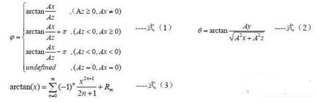 為了獲得系統基于重力向量的俯仰角θ和橫滾角φ,需要使用加速度計的三個輸出:Ax, Ay, Az.俯仰角和橫滾角可以通過以下公式(1)和公式(2)計算得到。對于微控制器,函數中的arctan(x)需要通過以下公式(3)的泰勒展開后才能計算得到。
