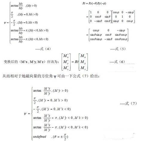為了獲得系統相對于當地地磁向量的方位角,需要使用MR傳感器的三個輸出Mx, My, Mz.當系統置于水平狀態時(俯仰角和橫滾角都為0)時,方位角ψ可以由公式(4)直接給出,但是在大多數情況下,系統并不是工作在水平狀態,此時地磁場的豎直分量將會影響Mx和My的值,因此不能直接由公式(4)獲得相對于地磁向量的方位角。為了在所有情況下都能獲得正確的方位角,必須將俯仰角和橫滾角考慮在內,即必須通過以俯仰角和橫滾角為參數的坐標變換,將測得的(Mx, My, Mz)向量變換為與載體坐標系有相同方位角的水平坐標系下的向量(M‘x , M’y, M‘z),其變換矩陣如公式(5)。