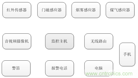 家庭監控系統是一個小型的多傳感器視頻集成監控系統。該系統利用網絡技術將安裝在家內的視頻、音頻、報警器、等監控設備和傳感器連接起來,通過中控電腦或設備的處理將有用信息存儲、傳輸和處理,實現對家庭安全的全方位監控。典型的家庭監控系統構成如下: