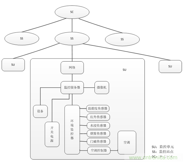動力環節監測系統應用在機房、基部站等無人值守的環境中,對局站內的通訊電源、蓄電池組、UPS、發電機、空調等智能、非智能設備以及溫濕度、煙霧、地水、門禁等環境量實現“遙測、遙信、遙控、遙調”等功能。為了實現對多個量的監測,動環系統集成了各種類的傳感器,是多傳感器集成系統傳感器“多類型”的一個經典案例。同時,此監控系統充分利用了通訊傳輸設備所能提供的各種傳輸信道資源,可以實現多級網管,能夠對所有局站的全參數、全方位的監控,這又很好體現了多傳感器集成系統傳感器“多數量”的一面。動環監測系統的組成如下: