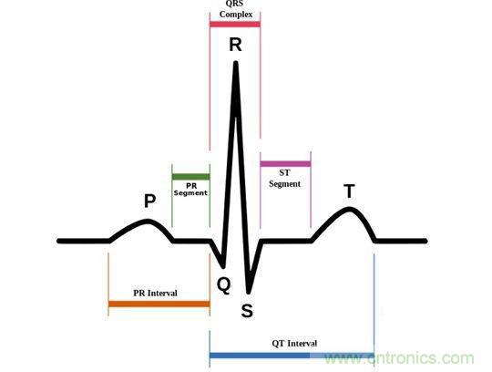 在心率監護儀或者運動設備中,人們可以根據心電圖中的P-QRS-T波峰信息中的幅度和時序、或者只是R波峰的時序等信息,得到復雜的心電向量圖,典型的心電圖。如圖一所示。