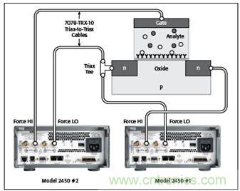 圖10:測試三端BioFET時兩部2450型儀器配置