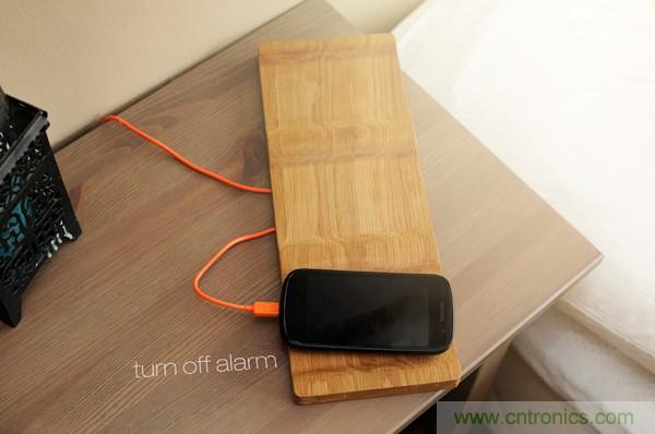 而Tangible Alarm的設計Tangible Alarm就像一塊長條形的木板,可以無線同步手機鬧鐘,通過簡單的移動手機,完成各種鬧鐘狀態的操作。Tangible Alarm共有三個移動的位置,包括小睡移動到右側、關閉移動到左側以及中間即是當前鬧鐘設置狀態。