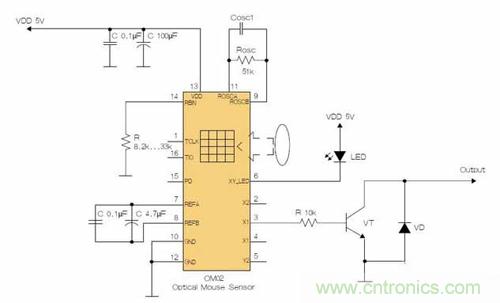 鼠標(biāo)芯片的CMOS光學(xué)傳感器可提供非機械式跟蹤引擎。在該芯片內(nèi)部可完成圖像的捕獲、數(shù)字化和數(shù)字處理。就拿簡單且低成本的OM02來說,該傳感器通過采集表面圖像幀來測量位置,并通過數(shù)學(xué)運算判定運動方向和距離。該傳感器安裝聚苯乙烯光學(xué)封裝中,設(shè)計用來與高亮度LED一起使用。它有一個完整且緊湊的跟蹤引擎;沒有活動部件,也不要求精密的光學(xué)對準(zhǔn)。OM02可以為X和Y方向運動產(chǎn)生正交輸出信號。分辨率約為0.0025英寸,運動速度最高為每秒16英寸。