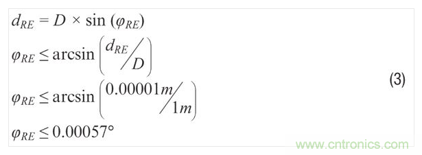 回過頭看圖2中的應用示例,將公式1和公式2結合便可把重要標準(檢查表面上的物理失真)與MEMS陀螺儀數據手冊通常會提供的噪聲性能指標(RND、ARW)關聯起來。在此過程中,假設公式1中的積分時間 (τ) 等于圖像捕捉時間可提供進一步且很有用的簡化。公式3利用公式1中的一般關系來估 計,當攝像頭距檢查表面1米 (D) 且最大容許失真誤差為10μm (dRE) 時,陀螺儀的角向誤差 (φRE) 必須小于0.00057°。