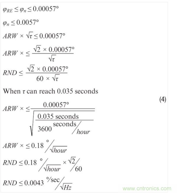 提供連續指向控制的系統開發者可能更愿意從角速率方面來評估噪聲影響,因為他們可能沒有固定的積分時間來利用基于ARW的關系。從角速率方面評估噪聲常常要考慮RND參數和陀螺儀信號鏈的頻率響應。對陀螺儀頻率響應影響最大的常常是濾波,其支持環路穩定標準的專用要求,并能抑制對 環境威脅(如振動)的不相干傳感器響應。公式5給出了一種簡單方法來估算與特定頻率響應(噪聲帶寬)和RND相關的 噪聲。