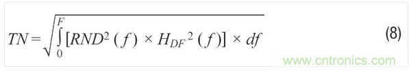 若系統需要定制濾波,其頻率響應 (HDF(f)) 不符合公式6和7中的簡單單極點和雙極點模型,則可利用公式8提供的更一般關系來預測總噪聲: