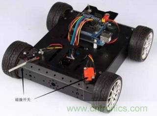 在機器人比賽中,碰撞開關(guān)經(jīng)常被用在碰撞壁障小車上(見圖3)。小車前端的碰撞開關(guān)在碰撞到障礙物時就會給控制器反饋一個信號,告訴控制器前方左側(cè)或右側(cè)有障礙物,程序再控制小車轉(zhuǎn)彎避開障礙物。