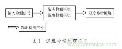 傳感器根據(jù)輸入的檢測信號,通過姿態(tài)檢測模塊和溫度檢測模塊采集相關(guān)數(shù)據(jù),然后經(jīng)過溫度補償模塊進行相應(yīng)的溫度補償,最后通過輸出檢測模塊可得到預期的檢測信號。姿態(tài)傳感器的溫度補償原理如框圖1所示。