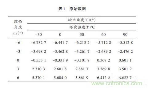由于各軸的檢測原理是相同的,因此本論文采用x軸的檢測數(shù)據(jù)進行實驗驗證。主要的實驗儀器有被測姿態(tài)傳感器、經(jīng)緯儀、高低恒溫箱、高精度角度檢測儀等。表1所得數(shù)據(jù)是未經(jīng)溫度補償時的實驗數(shù)據(jù),即原始數(shù)據(jù)。