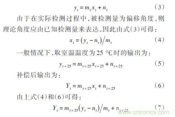 傳感器未經(jīng)溫度補償時的輸出為y = mx + n ,即在t ℃時,無補償輸出為: