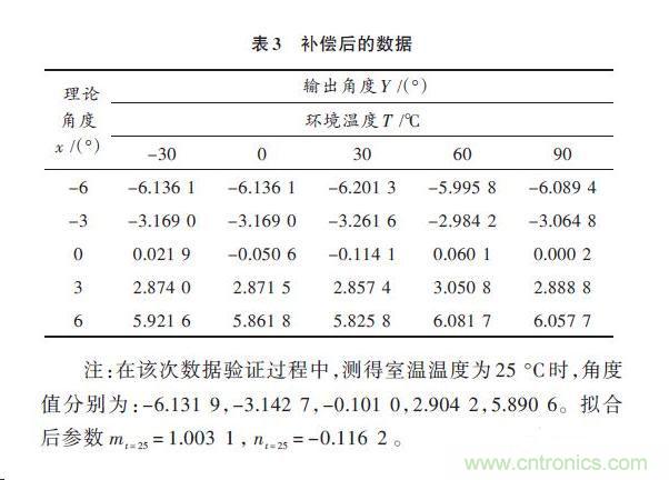 根據(jù)式(1)、(2)、(7)可得補償后的輸出值。償后的數(shù)據(jù)如表3所示。在表1中未補償前的最大誤差角度為0.682 7°,表3中補償后的最大誤差角度為0.261 6°,相對減少的誤差角度為0.421 1°。
