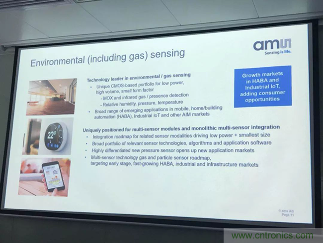 在環境方面,艾邁斯半導體有溫度、壓力、氣體、濕度傳感器,會應用于IoT市場或者是移動市場。艾邁斯半導體可以把所有的這些傳感功能集成到單芯片上,因此,它可以做得非常小,但是功能又非常齊全。艾邁斯半導體的壓力傳感器非常有趣,它的靈敏度可以根據氣壓來測量,這個可以用于室內GPS。