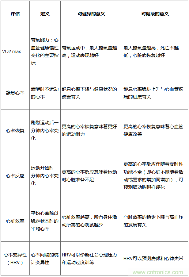 【導(dǎo)讀】在日益數(shù)字化的世界中,光學(xué)心率傳感器在可穿戴設(shè)備中的應(yīng)用越來越廣泛。這些設(shè)備中數(shù)不清的應(yīng)用可提供從個人活動、健身水平到健康狀況的所有內(nèi)容。精準的生物識別傳感器數(shù)據(jù)可以提供準確的健身/健康評估,但設(shè)計師和工程師究竟能用這些評估做些什么呢?表1總結(jié)了目前在健身應(yīng)用中使用的一些常見評估,這些評估也證明了健康醫(yī)療的意義。