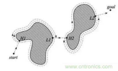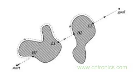 Bug算法應該是最簡單的一種避障算法了,它的基本思想是在發現障礙后,圍著檢測到的障礙物輪廓行走,從而繞開它。Bug算法目前有很多變種, 比如Bug1算法,機器人首先完全地圍繞物體,然后從距目標最短距離的點離開。Bug1算法的效率很低,但可以保證機器人達到目標。