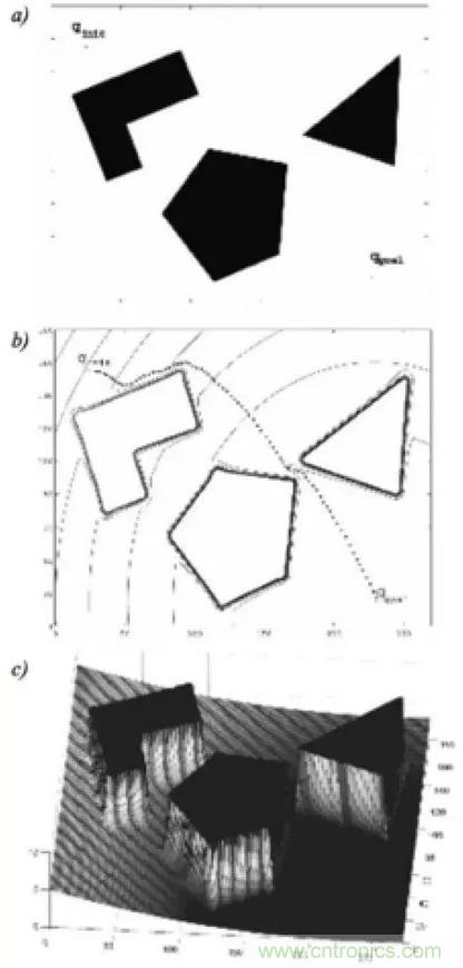 上面這個圖是勢場比較典型的示例圖,最上的圖a左上角是出發點,右下角是目標點,中間三個方塊是障礙物。中間的圖b就是等勢位圖,圖中的每條連續的線就代表了一個等勢位的一條線,然后虛線表示的在整個勢場里面所規劃出來的一條路徑,我們的機器人是沿著勢場所指向的那個方向一直行走,可以看見它會繞過這個比較高的障礙物。