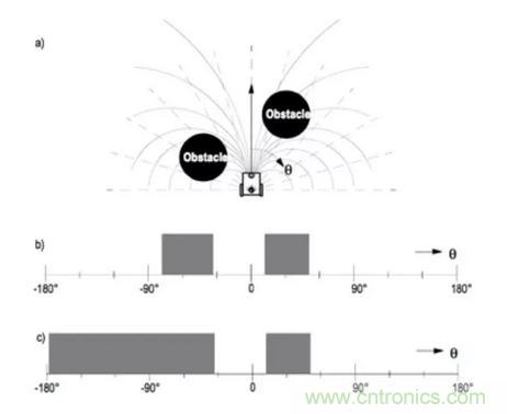 圖中x軸是以機器人為中心感知到的障礙物的角度,y軸表示在該方向存在障礙物的概率大小p。實際應用的過程中會根據這個直方圖首先辨識出允許機器人通過的足夠大的所有空隙,然后對所有這些空隙計算其代價函數,最終選擇具有最低代價函數的通路通過。