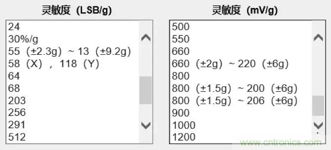 靈敏度(LSB/g)主要針對數字輸出加速度傳感器,代表一個重力加速度(g)下,輸出能區分多少位LSB。上面已經根據應用要求推導出,假設應用要求最小分辨率為1°,靈敏度需要大于58LSB/g。那么可以根據這一結果直接在參數欄里選擇。