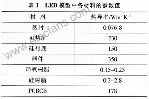 LED輸入功率為1W,光效率取10%;封裝體外部的各組件(包括MCPCB、陶瓷封裝、熱沉的外部)通過與空氣的對流散熱;器件與外界的熱對流系數(shù)為20。工作環(huán)境溫度為25℃;器件滿足使用ANSYS軟件進(jìn)行穩(wěn)態(tài)有限元熱分析的條件;最大結(jié)溫選擇為125℃。各種材料的參數(shù)如表1所示。