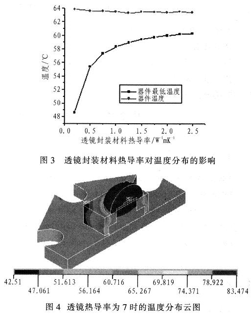 只考慮熱傳導(dǎo)與對流,改變不同封裝填充材料如硅樹脂.得出結(jié)果,如圖3所示。即使找到一種熱導(dǎo)率高達(dá)7Wm-1K-1的環(huán)氧樹脂成分封裝材料時,相比使用熱導(dǎo)率為0.25Wm-1K-1的環(huán)氧樹脂成分封裝材料時,芯片溫度下降不多,鋁基板溫度只下降了2.271℃,最大功率僅提高了0.69W。實(shí)際上,熱導(dǎo)率值超過7Wm-1K-1以上、可商業(yè)化的透明硅樹脂封裝材料目前尚無文獻(xiàn)報導(dǎo)。分布云圖如圖4所示。