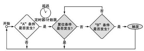 源自電腦編程領(lǐng)域的IF-THEN-ELSE構(gòu)成了這類觸發(fā)結(jié)構(gòu)的概念模型。如圖1所示,這些語(yǔ)句還包括其它判定符(如A和B之間的定時(shí)器/計(jì)數(shù)器)。不管B事件是否發(fā)生,在A事件之后隨時(shí)都可以發(fā)生復(fù)位。