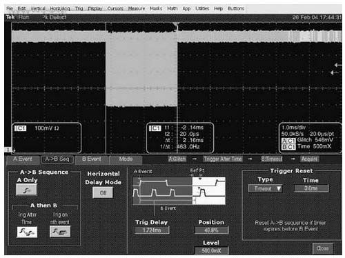 在這一過(guò)程中,A事件啟動(dòng)延遲計(jì)數(shù)器,計(jì)算脈沖數(shù)量。一旦產(chǎn)生了32個(gè)脈沖,它會(huì)使B觸發(fā)器監(jiān)測(cè)第33個(gè)脈沖。當(dāng)檢測(cè)到特定脈寬時(shí),B系統(tǒng)便設(shè)成觸發(fā)采集,這時(shí),示波器觸發(fā)并記錄數(shù)據(jù)。如果沒(méi)有第33個(gè)脈沖,復(fù)位條件會(huì)重新準(zhǔn)備A觸發(fā)器,再次啟動(dòng)整個(gè)流程。