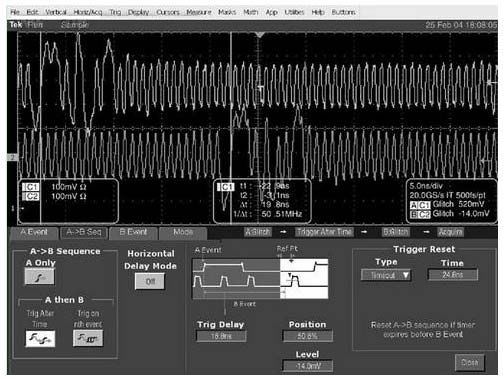 這些快速新協(xié)議中的錯(cuò)誤可能來(lái)自多個(gè)事件的綜合結(jié)果,如邏輯狀態(tài)、偏移、瞬變、上升時(shí)間問(wèn)題等。有時(shí),必需規(guī)定非常精確的條件范圍,以確定難以捕捉的錯(cuò)誤。這要求觸發(fā)工具系列能夠分析更多的條件。可以采用雙觸發(fā)排列來(lái)解決這一問(wèn)題,其中B觸發(fā)系統(tǒng)與A系統(tǒng)基本上相同。只是在許多情況下,A條件相對(duì)簡(jiǎn)單,而在理想情況下,B觸發(fā)器應(yīng)能夠評(píng)估比較復(fù)雜的一套指標(biāo),如只在其它邏輯信號(hào)處于規(guī)定狀態(tài)時(shí)才會(huì)有效的事件數(shù)量等。但是,相關(guān)觸發(fā)B一直缺乏A觸發(fā)系統(tǒng)的靈活性。因此大多數(shù)示波器僅提供了非常簡(jiǎn)單的B觸發(fā)器。