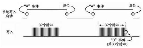 本系統(tǒng)中,讀/寫電路中的一個(gè)單元設(shè)計(jì)成在每個(gè)有效系統(tǒng)寫入啟動(dòng)(WE)周期中執(zhí)行一串32條寫入命令。圖2描述了較大的周期時(shí)間與導(dǎo)致數(shù)據(jù)寫入的各個(gè)脈沖的關(guān)系。
